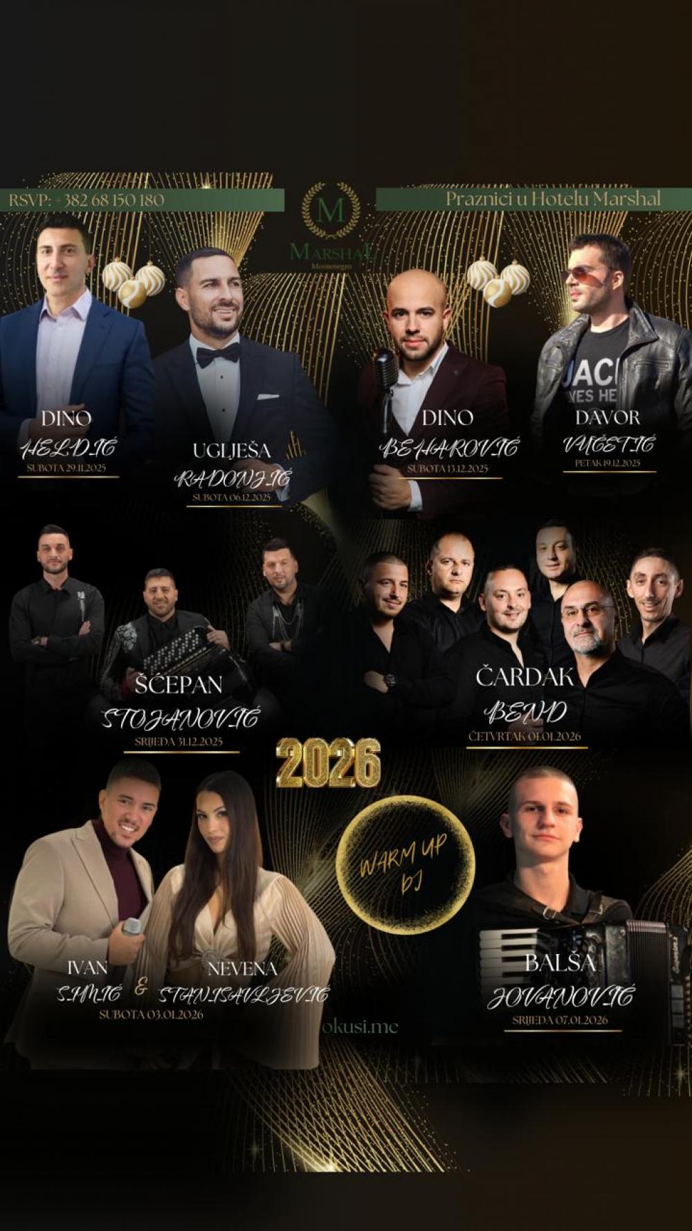 Hotel Marshal najavljuje izuzetno bogat muzički program koji će obilježiti kraj 2025. i početak 2026. godine. Posjetioce očekuje serija nastupa popularnih izvođača, uz warm up DJ-a svake večeri, koji će dodatno podići atmosferu i pripremiti goste za nezaboravne noći.
